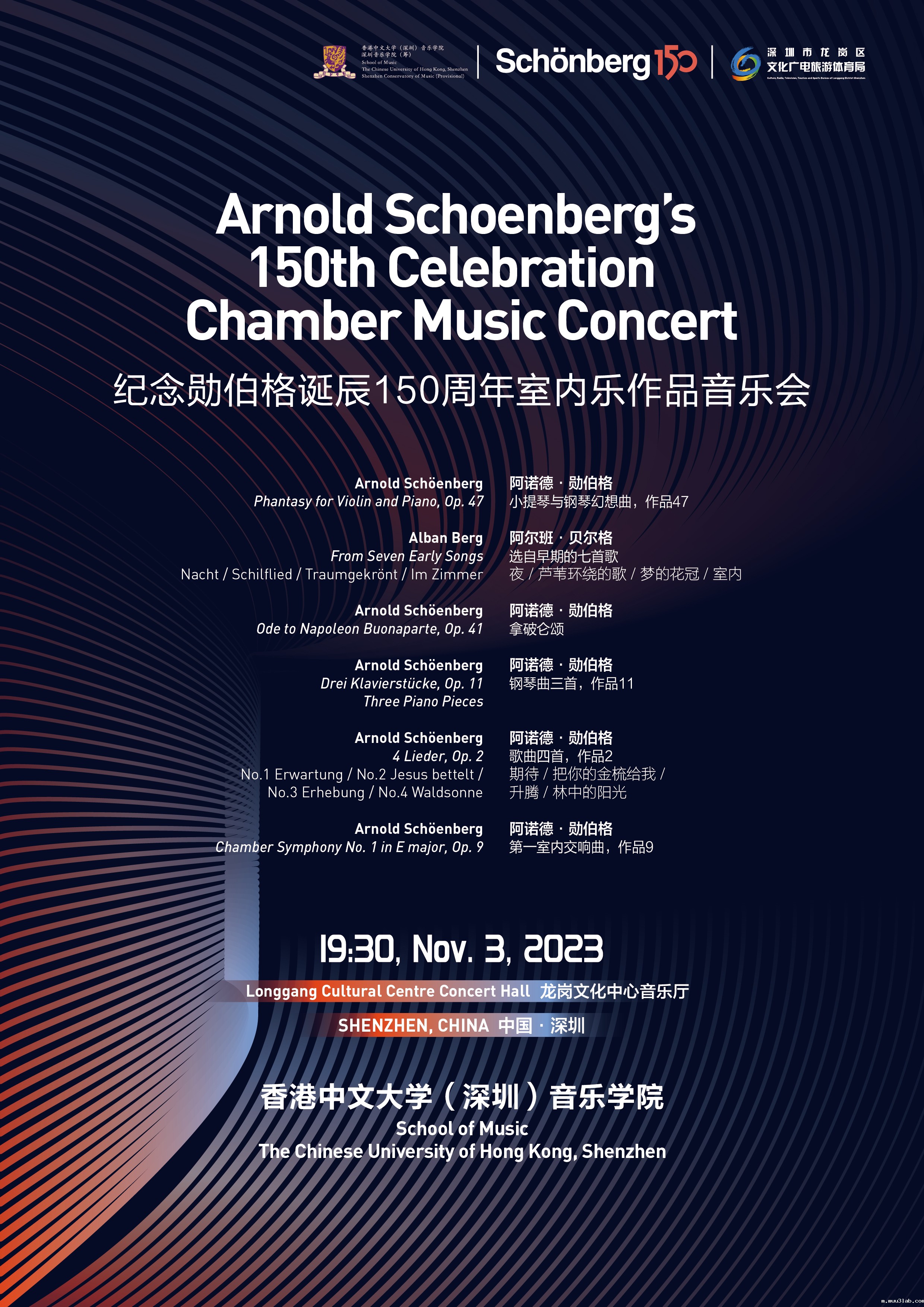 作为勋伯格全球纪念活动的重要部分,研讨会期间将于11月3日晚在龙岗文化中心音乐厅上演勋伯格室内乐作品音乐会,于11月4日晚在龙岗文化中心大剧院上演由美国作曲家托德·马克奥弗尔创作的歌剧《勋伯格在好莱坞》。