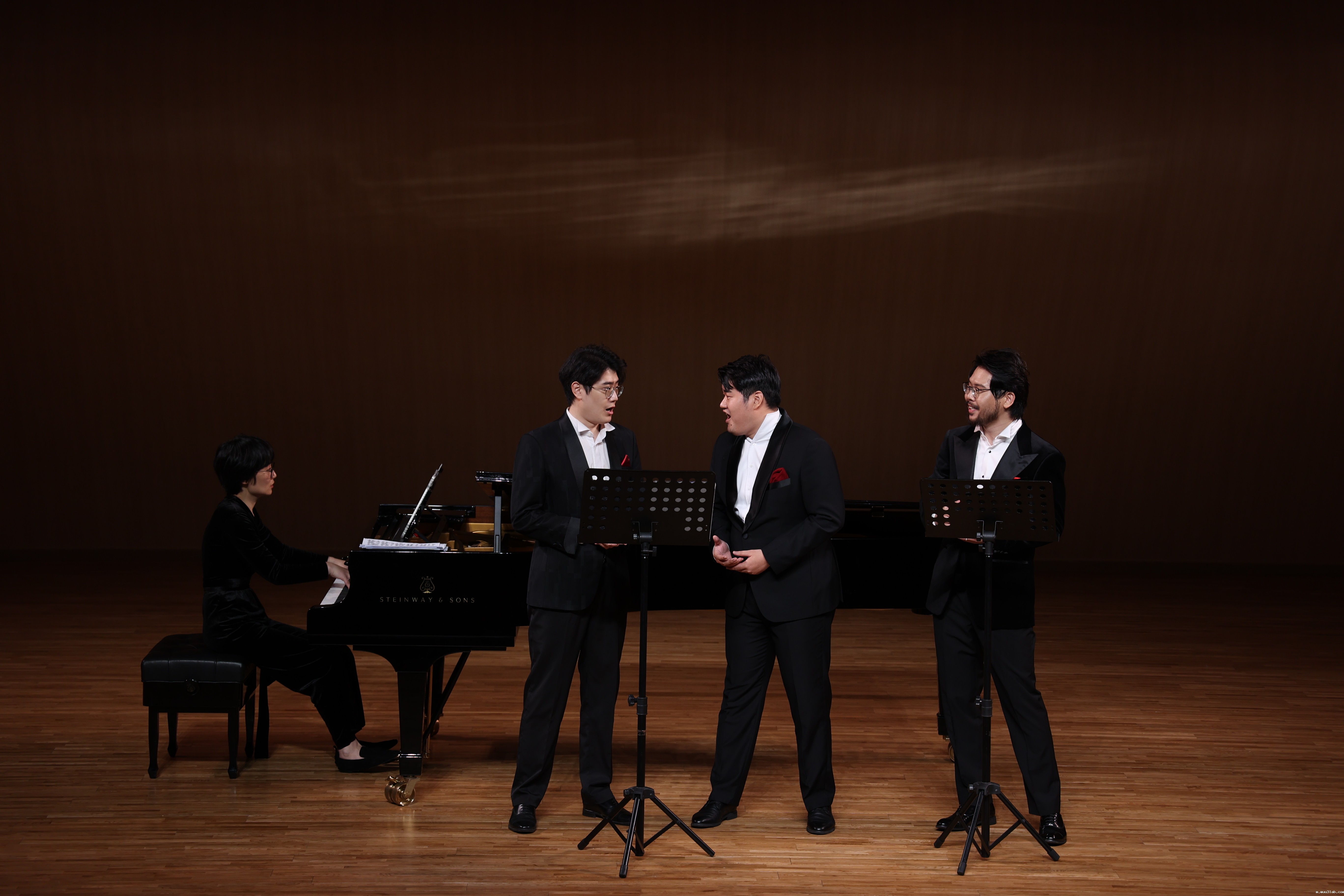 学生夏德奇(中)、戴宸(左)、任廷(右)合唱《城南送别》,艺术指导:文茗老师