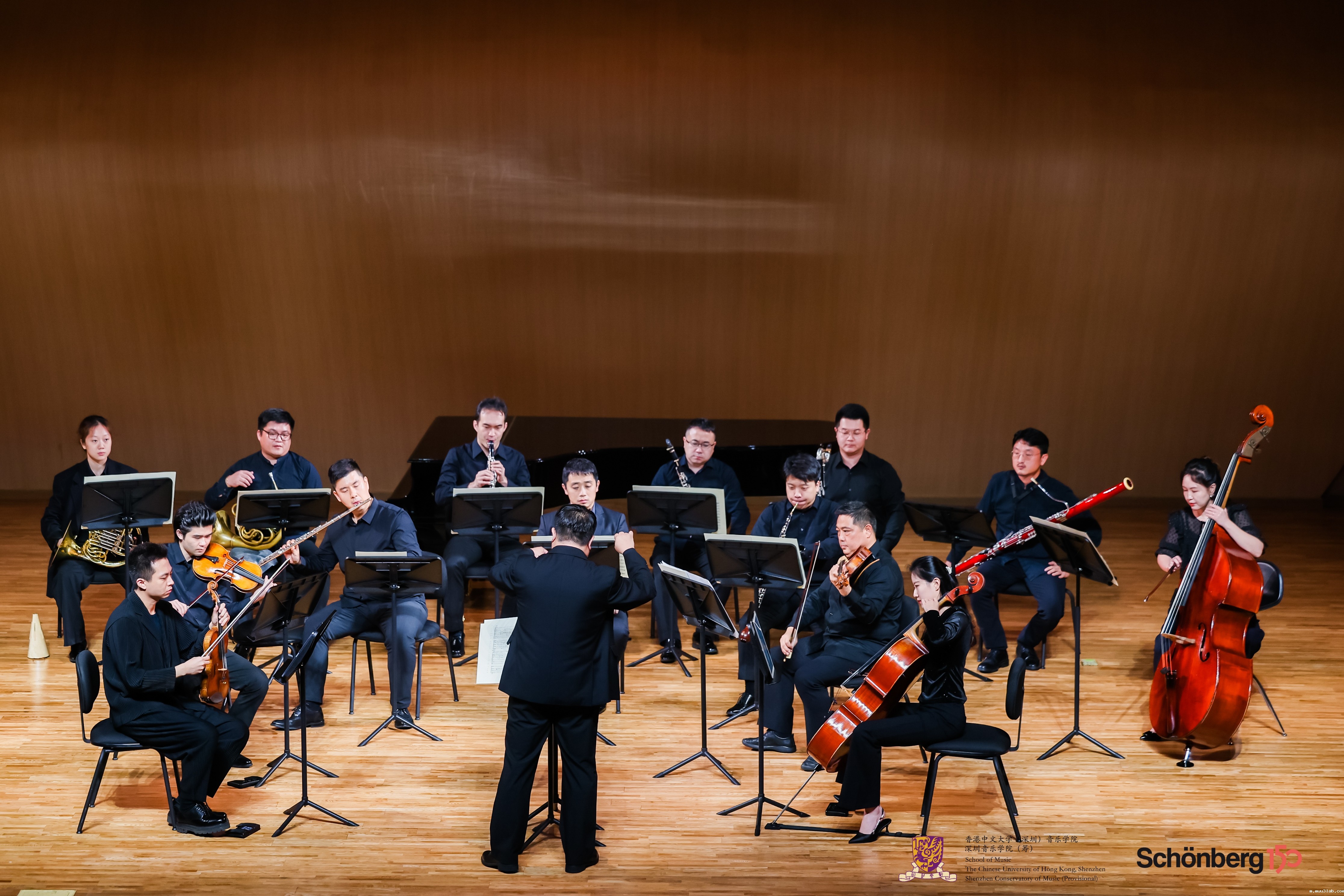 On the evening of November 3rd, a concert featuring Schoenberg's chamber music works was held at the Longgang Cultural Centre Concert Hall. The performance was conducted by Prof. Yu LIU and featured prominent mezzo-soprano, Prof. Ning LIANG from the School of Music, CUHK-Shenzhen, along with invited tenor LUO Xiaoqing from Hong Kong SAR, among other outstanding teachers and artists from the School. The concert included representative works of Schoenberg from different periods, including Chamber Symphony No.1 in E major, Three Piano Pieces, Phantasy for Violin and Piano, and Ode to Napoleon. The concert also featured early vocal works by another important composer of the New Viennese School, Alban Berg.