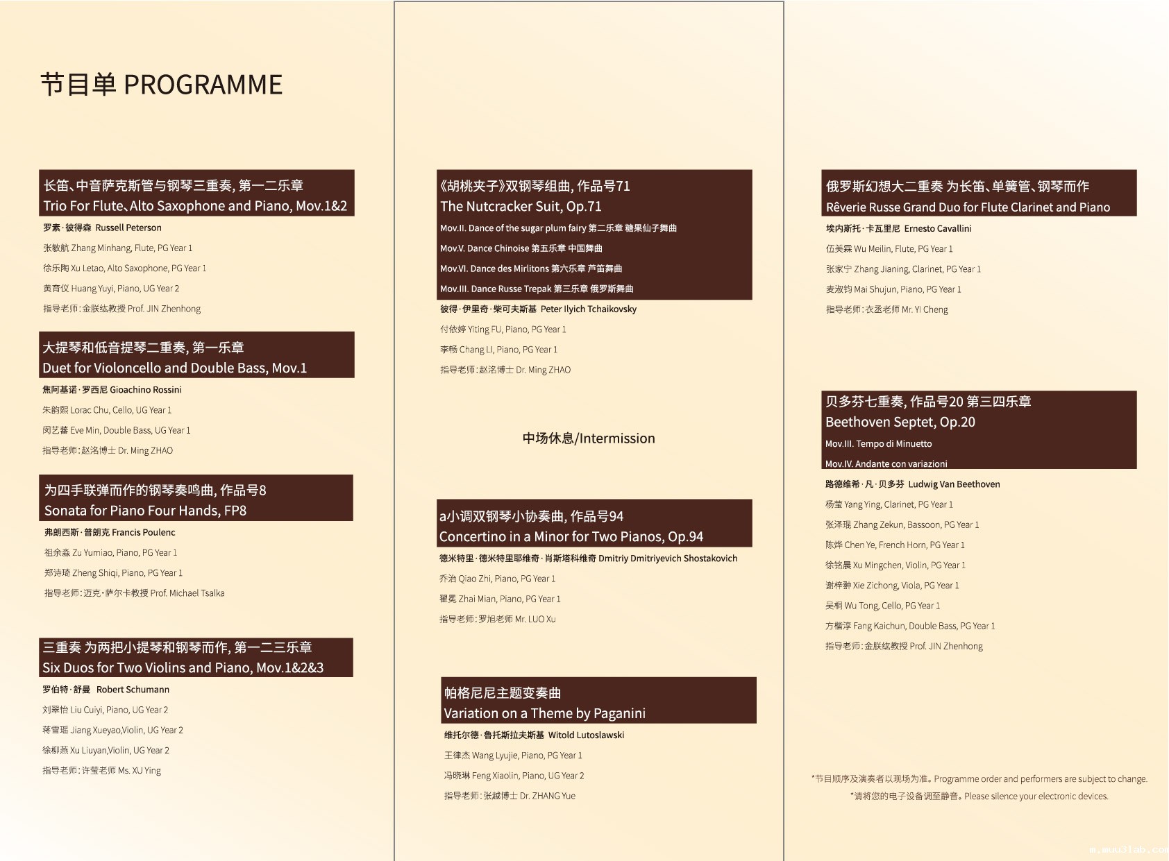 两场室内乐音乐会由我院院长叶小钢担任艺术总监,室内乐学部和学术主任、著名中提琴家金朕纮教授担任音乐总监。音乐会曲目选自室内乐的经典之作:钢琴作品方面,有舒伯特的F小调幻想曲、魯托斯拉夫斯基的帕格尼尼主题变奏曲、肖斯塔科维奇A小调双钢琴小协奏曲、柴可夫斯基《胡桃夹子》双钢琴组曲等,精彩的四首联弹和双钢琴的和谐演奏将带给观众独特的音乐感受;管弦和打击乐作品方面,铜管五重奏带来《德国民谣》组曲选段,俄罗斯幻想大二重奏为长笛、单簧管、钢琴而作,还有俏皮的打击乐《鼓之舞》,令人沉醉的贝多芬七重奏和德沃夏克第二钢琴五重奏等等。这些古典室内乐佳作,将带来不一样的夏日治愈,留给观众更多的音乐想象空间,点燃大家的音乐热情。