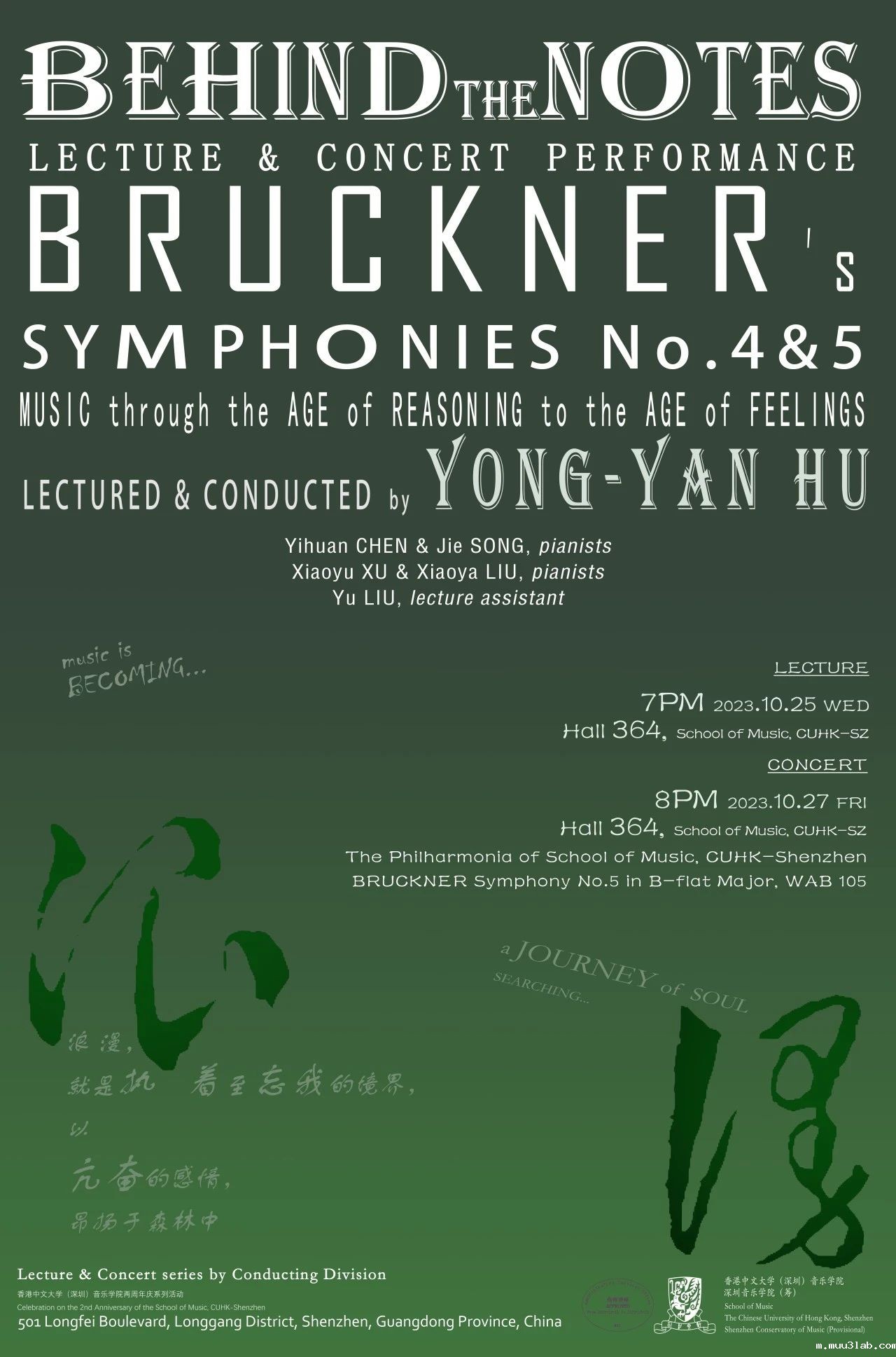 单个分散而零碎的音高也许缺乏音乐思想,但当这些音符由作曲家通过不同频率和时值的组合有序排列到一起的时候,音乐的背后即屹立起一座古典音乐巨匠的哲理雕塑。布鲁克纳的音乐满载着对人生和生命的深邃思考,他每一处动机的产生和发展,都值得我们专注地品味。本系列活动将为学生们提供一个深入了解布鲁克纳的音乐世界、在古典音乐领域拓展视野与吸收知识的机会。无论您是音乐专业的学生,还是对古典音乐有浓厚兴趣的人士,我们诚挚地邀请您参加这一独特的学术讲座和音乐会活动。