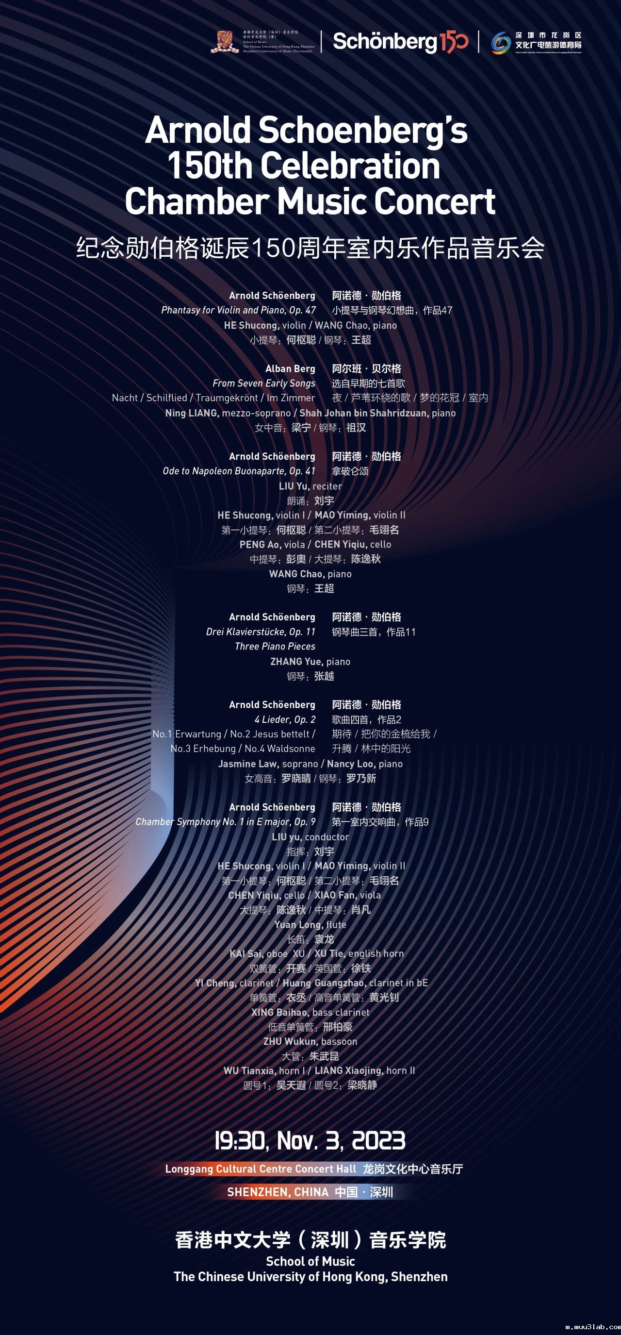 作为勋伯格全球纪念活动的重要部分,研讨会期间将于11月3日晚在龙岗文化中心音乐厅上演勋伯格室内乐作品音乐会,于11月4日晚在龙岗文化中心大剧院上演由美国作曲家托德·马克奥弗尔创作的歌剧《勋伯格在好莱坞》。