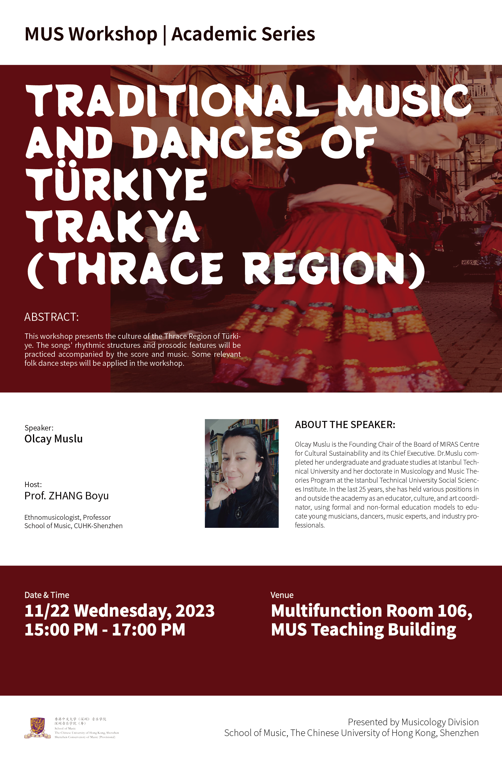 11月22日,作为我院音乐学学部11月学术系列活动的首场工作坊活动,我们邀请到MIRAS文化可持续发展中心董事会创始主席兼首席执行官Olcay Muslu博士,她将为大家介绍土耳其色雷斯地区的传统文化和民间音乐的特点。同时,Muslu博士还将带领大家练习土耳其传统歌曲的节奏结构、拟声特点以及学习土耳其民间舞蹈舞步。