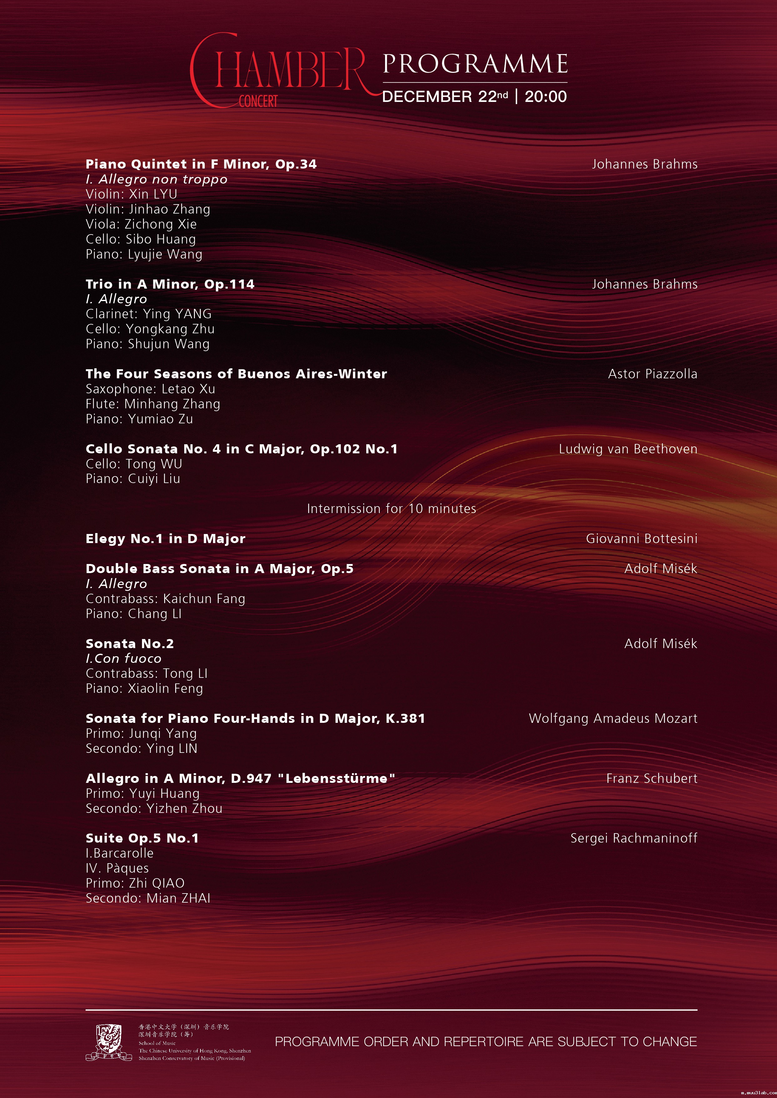 本次系列音乐会活动,学生们将以重奏的形式演绎精心准备的涵盖了多种不同音乐风格的室内乐作品。无论是钢琴五重奏、弦乐四重奏,亦或者是单簧管、大提琴与钢琴三重奏,长笛、巴松及钢琴三重奏,还是打击乐重奏的合作演出都将在本次系列音乐会活动中缤纷呈现。作为期末汇报演出的一部分,学生们经过长时间的努力和钻研,认真刻苦地准备了每一首乐曲,将通过这次机会展示自身在技巧、表现力和艺术修养方面的进步,为观众们带来难忘的音乐体验。
