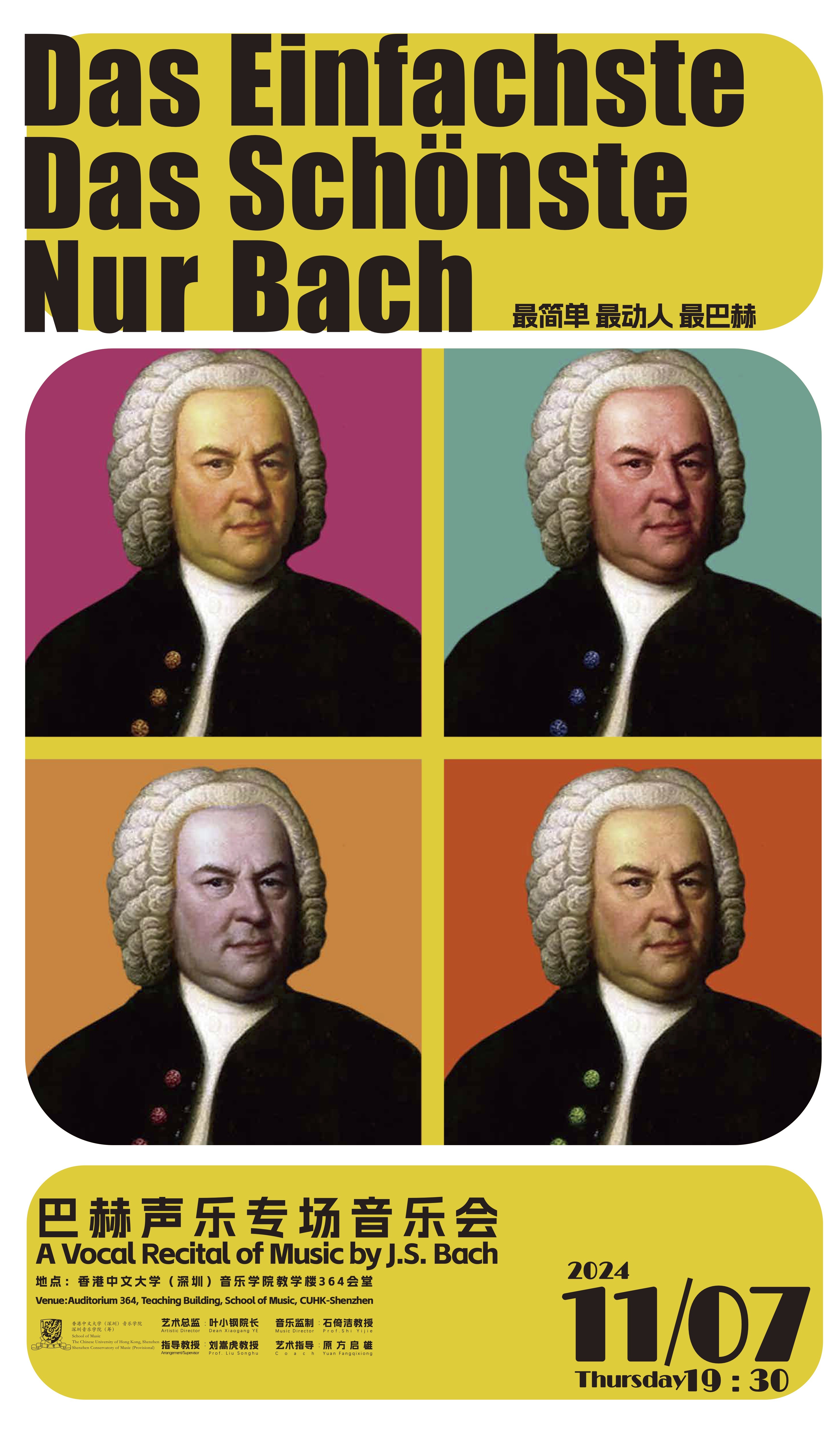 我院歌剧与声乐学部将于11月7日(周四)19:30,为您呈现一场别开生面的音乐会:《“最简单,最动人,最巴赫” ——巴赫声乐专场音乐会》。来自我院音乐表演专业的17位学生将以他们专业的技艺和无限的热情,为大家带来一场视听盛宴。本场音乐会精心挑选了巴赫最具代表性的声乐作品,演出极具艺术价值与学术价值,这也是学院首次以巴赫声乐专场音乐会的形式带给观众。
