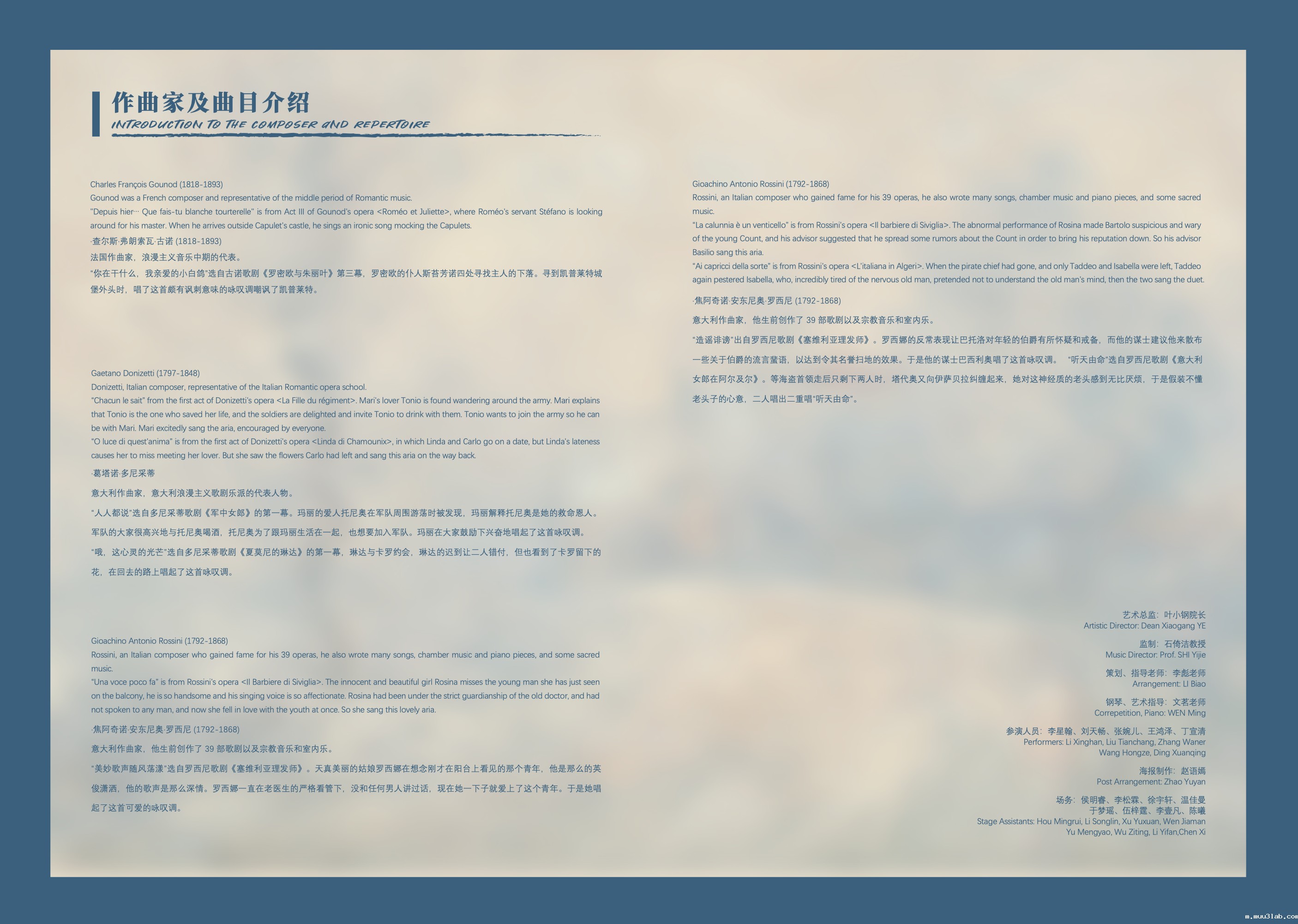 本场音乐会由我院院长叶小钢教授担任艺术总监,石倚洁教授监制,李彪老师策划、指导,文茗老师担任本场艺术指导。
