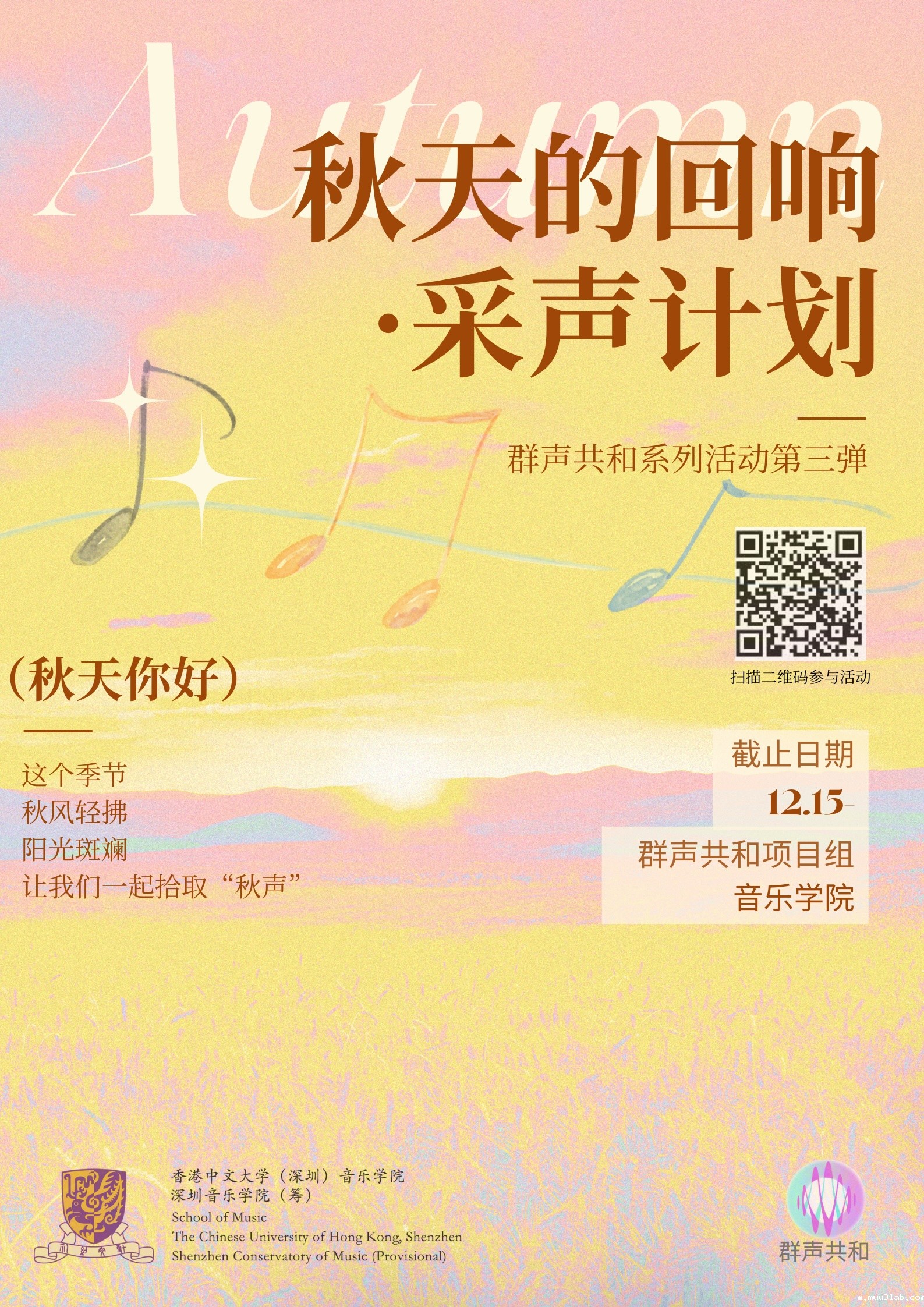 必威首页登录平台“群声共和项目组”开启系列活动第三弹:采声计划·秋天的回响。现诚挚邀请香港中文大学(深圳)师生们一同参与,与我们共同谱写一曲属于“秋天的回响”的美妙乐章。