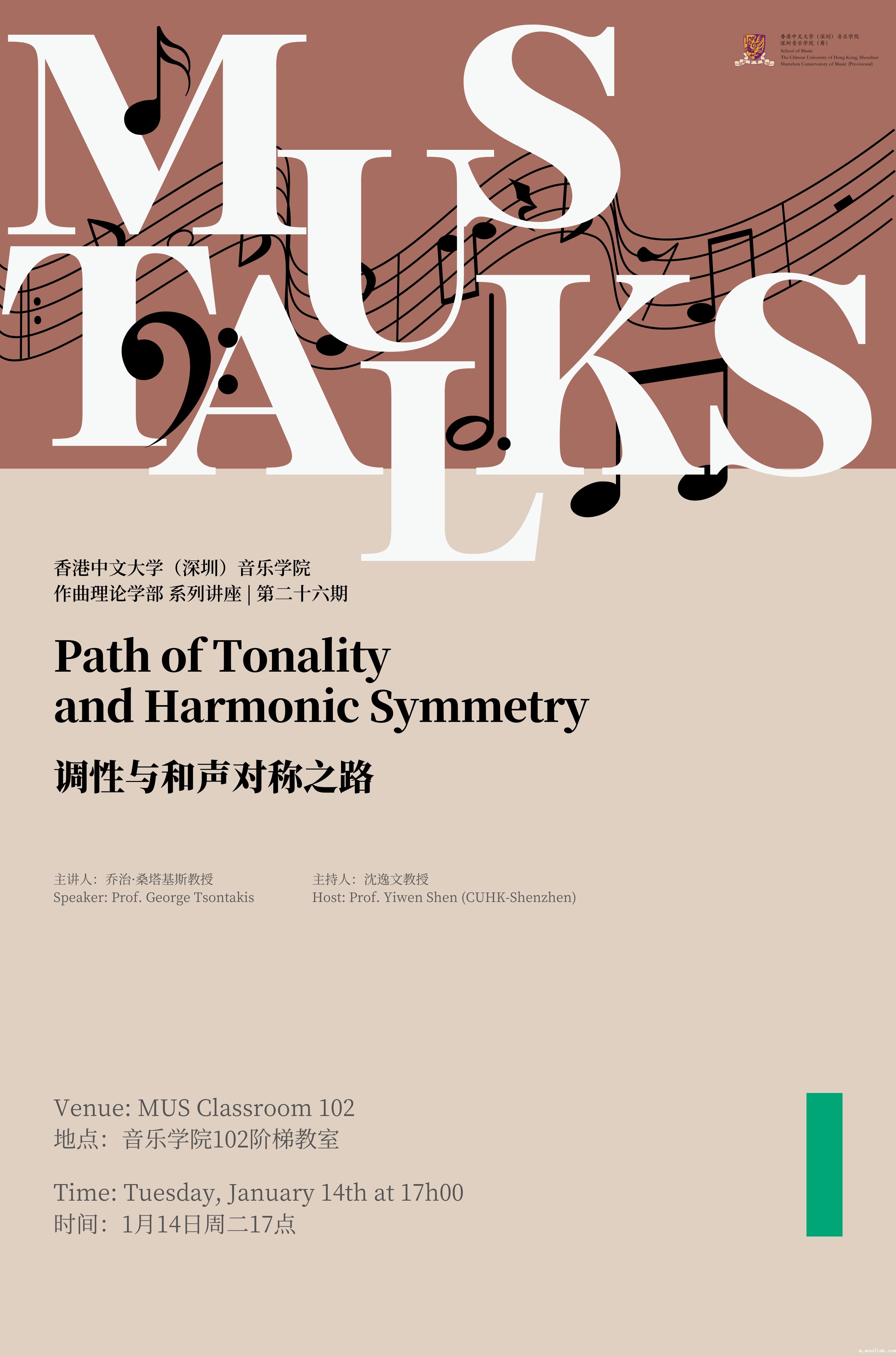 音乐的魅力是音乐家创造的成果,是音乐欣赏者探求的奥秘。MUS Talks 系列讲堂旨在提供一个持续性的分享平台,邀请来自五湖四海的专家学者在此分享学术界关于当今音乐的最新动向与研究成果,传播全球化的音乐教育理念,让学生在提高艺术与学术水平的同时能从中收获触类旁通的灵感,努力践行“精于艺,博于文;志于道,成于行”的精神与理念。