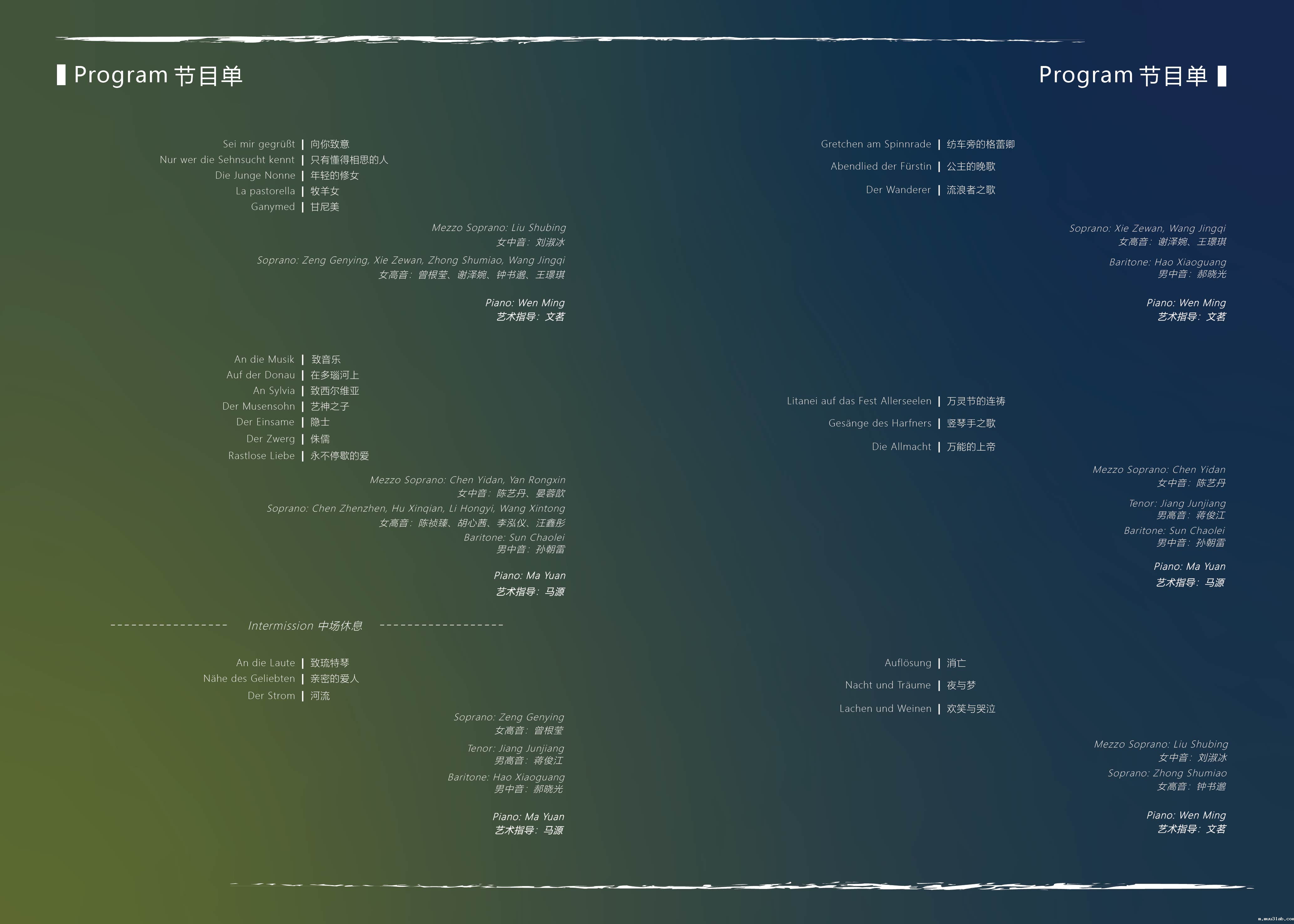 “昙”是他早逝的宿命,如同冬夜呵出的白气,转瞬即逝;“永”则是他藏在音符中的魔法:钢琴的涟漪托着歌声,穿透两百年的时光,至今仍在人们耳边回响。艺术歌曲最深邃的奥秘在于它让易逝的人声与永恒的乐谱达成契约——当最后一个音符消散,那些关于存在与消逝的哲思,早已悄然镌刻在听者的记忆深处,成为比作曲家生命更为恒久的存在。舒伯特的音乐,既是瞬间的绽放,也是永恒的铭刻,仿佛在提醒我们:生命的短暂与艺术的永恒,本就是一场无声的对话。